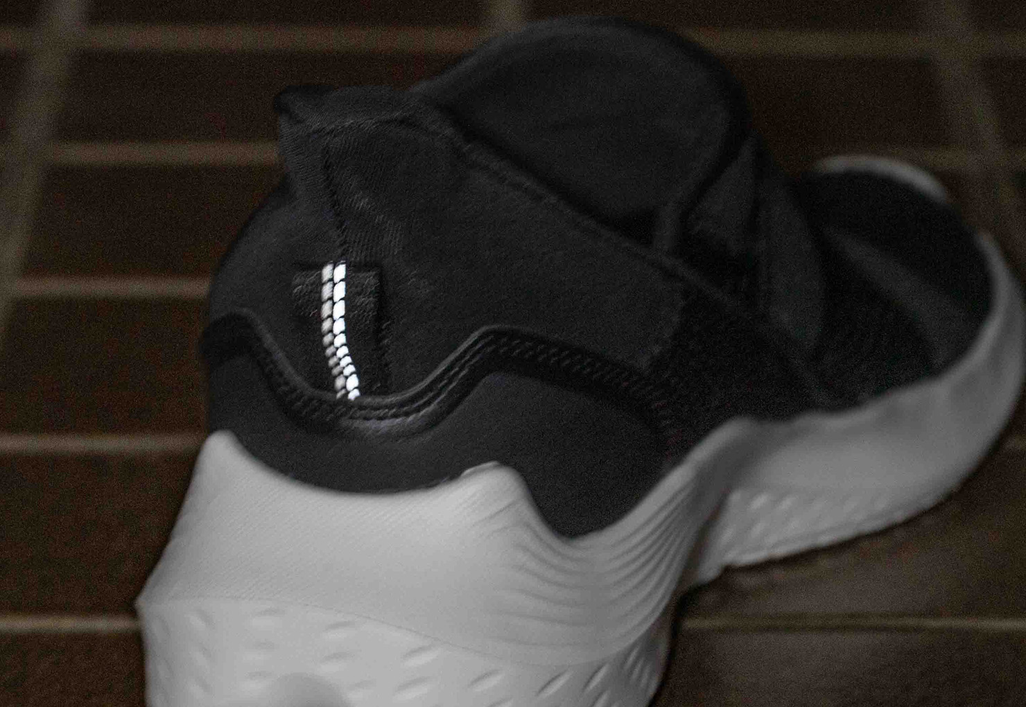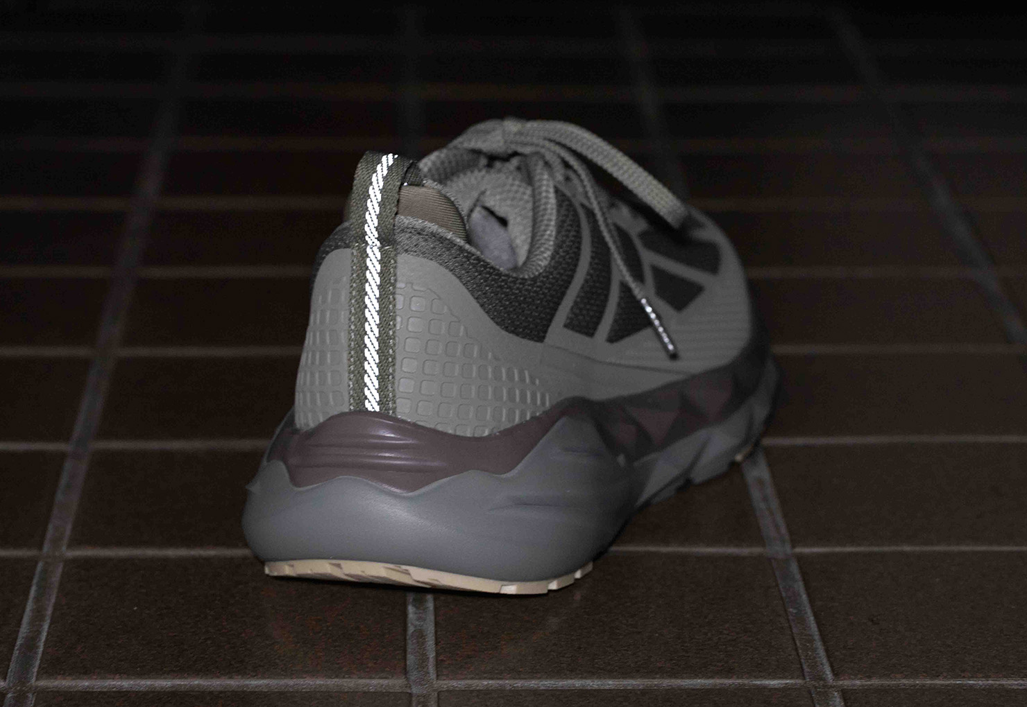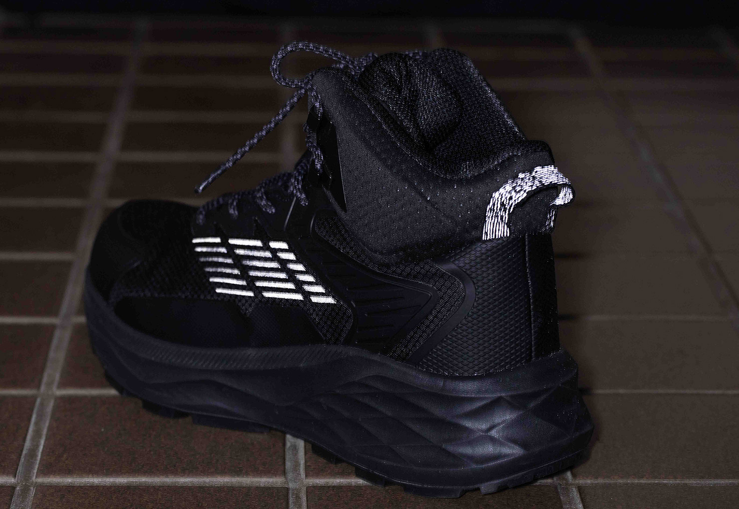 サイド~かかとへと広範囲に渡ってデザイン性のある反射材がついている
