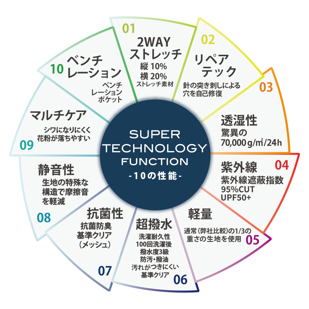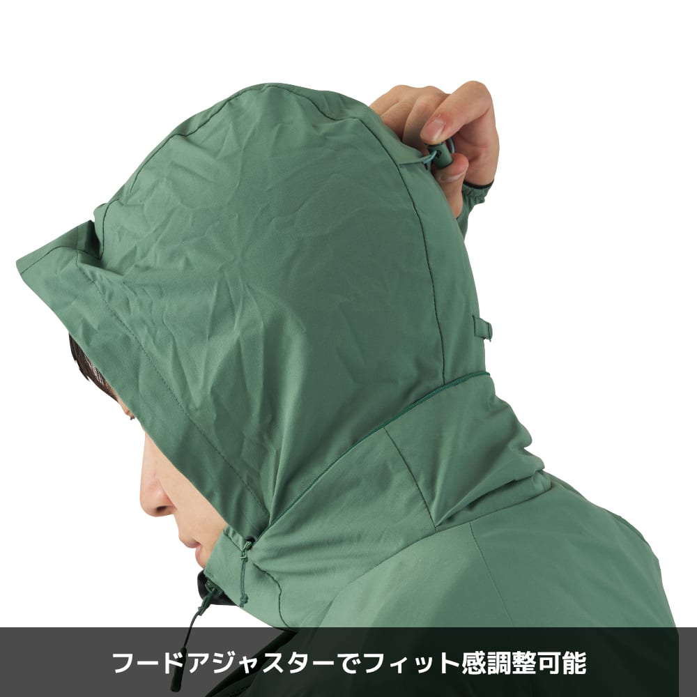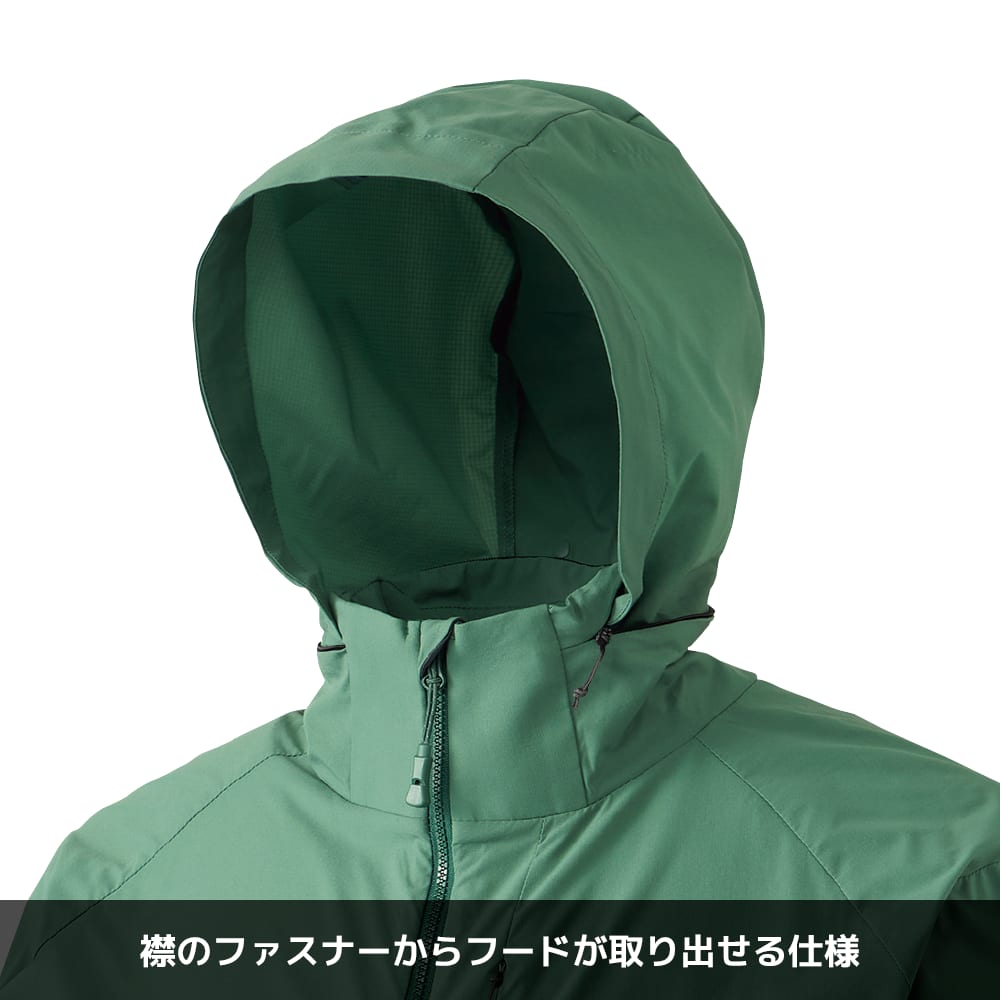 ●商品の特徴●快適に過ごせる10の性能・2WAYストレッチ・リペアテック(針の突き刺しのよる穴を自己修復)・透湿性驚異の70,000g/m2/24h・UVカット(UPF50+)・軽量・超撥水(洗濯を約100回繰り返しても撥水力が続く!)・抗菌性(メッシュ)・静音性(摩擦音を軽減)・マルチケア(シワになりにくく、花粉が落ちやすい)・ベンチレーション(胸ポケットとサイドポケットはベンチレーションポケット)便利な機能・フロントファスナー引き手にホイッスル付き・右ポケットにジャケット本体を収納可能なポケッタブル仕様・ファスナーを開けたままでもフロントを固定できるスナップボタン付き・サムホール仕様で手の甲もガード!・肩後ろにドット反射付きで視認性をサポートこだわりの襟&フード・襟のファスナーからフードが取り出せる2WAYスタイル・フードアジャスターで、フィット感調整可能・肌触りの良い襟元