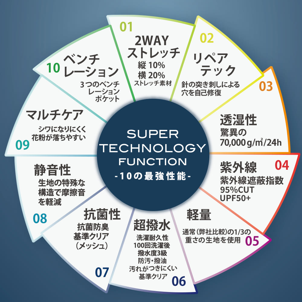 ●商品の特徴●快適に過ごせる10の性能・2WAYストレッチ・リペアテック(針の突き刺しのよる穴を自己修復)・透湿性驚異の70,000g/m2/24h・紫外線カット(UPF50+)・軽量・超撥水(洗濯を約100回繰り返しても撥水力が続く!)・抗菌性(メッシュ部分)・静音性(摩擦音を軽減)・マルチケア(シワになりにくく、花粉が落ちやすい)・ベンチレーションポケット便利な機能・右ポケットに収納可能なポケッタブル仕様・ウエストバックシャーリング+調節ヒモ付きで快適な穿き心地に!・サイドファスナーポケットベンチレーション・後ろベンチレーションポケットこだわりの裾・右裾口に視認性をサポートするドット反射・裾はファスナーで広げることができるので、着脱ラクラク
